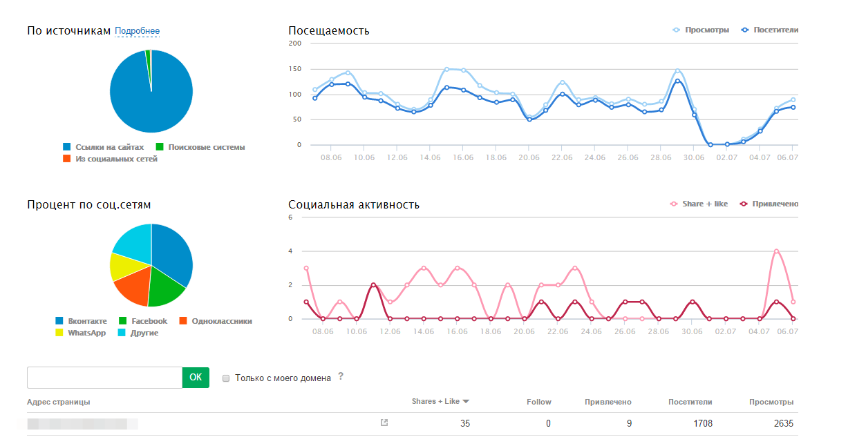 Для тех, у кого есть время и желание анализировать эффективность социальных кнопок, тестировать их разные варианты, совершенствовать контент, UpToLike предлагает бесплатный аналитический инструмент. Помимо статистики кликов, лайков, фолловеров и прочего, пользователь получает информацию о привлеченных пользователях, причем постранично (что недоступно в Яндекс.Метрике и Google Analytics). Таким образом, вы будете точно знать, какой контент или какая версия контента и кнопок в сплит-тесте оказались наиболее эффективными.